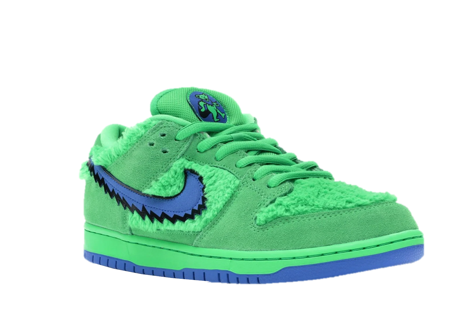 The SB Dunk Low Grateful Dead Bears Green features a fuzzy green faux-fur upper with suede overlays and a jagged Swoosh to represent the stylization of the bear’s chest fur.